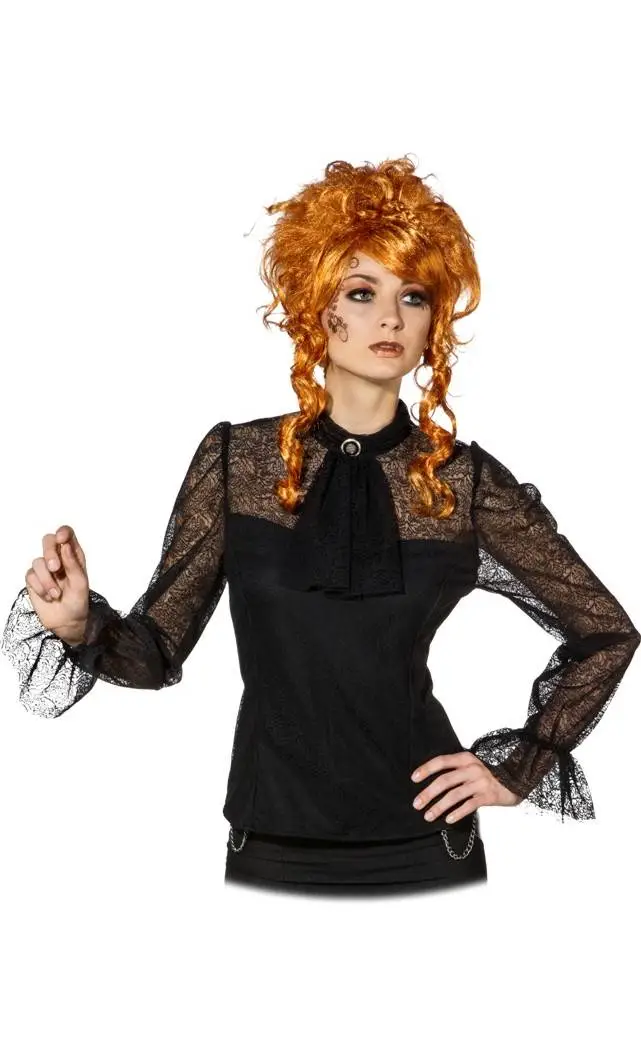 C’est une blouse noire entièrement couverte de dentelle et agrémentée d’un jabot avec bijou cousu.