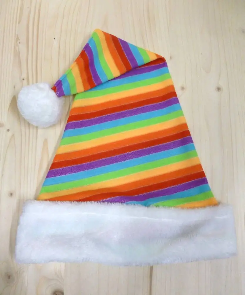 Bonnet de Noël en tissu arc – en – ciel et peluche blanche avec pompon.