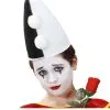 Bonnet de lutin adulte rouge en feutre rouge souple, à nouer sous le cou, accompagné d’une barbe grise indépendante. Le bonnet est bordé de bouclettes qui font office de cheveux.
