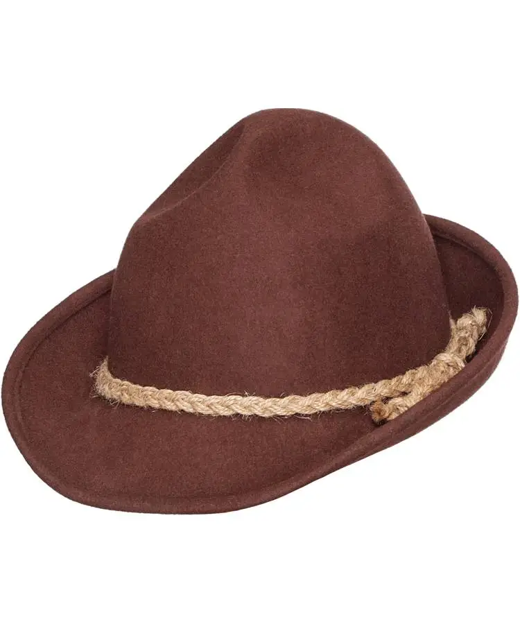 Chapeau tyrolien de qualité pour adulte aspect réaliste, en feutre de laine brun avec une cordelière en paille tressée.