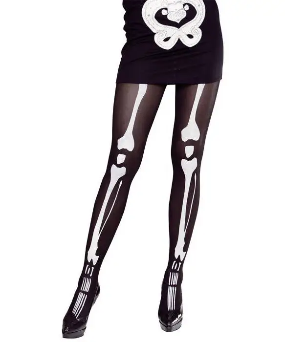 Collant squelette pour femme. Ce collant de qualité 40 deniers est noir avec des impressions blanches d’os, tibia, fémur, et autres.