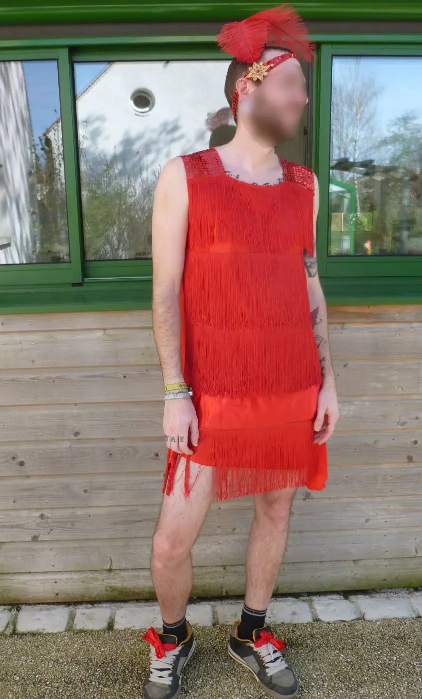 Le costume se compose d’une robe charleston rouge, d’un bandeau charleston et de rubans pour le dessus des pieds.