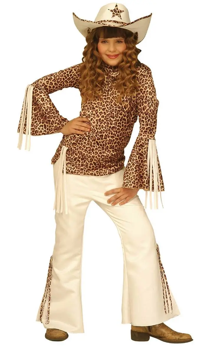 Cette tenue se compose d’une tunique, d’un pantalon et d’un chapeau de cowboy. L’ensemble est décoré de tissu à motif léopard.