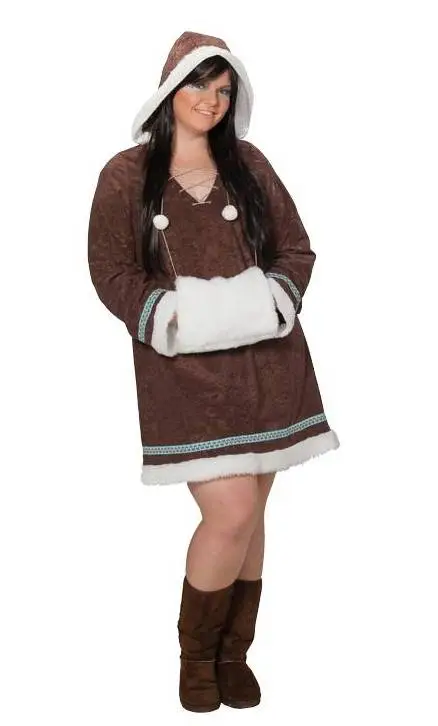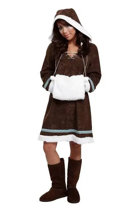 Déguisement d’esquimau pour femme. Ce costume est composé d’une robe d’esquimau et d’un manchon.