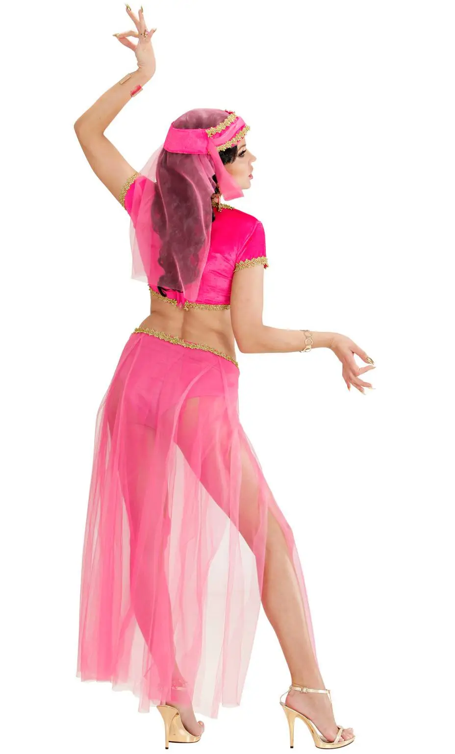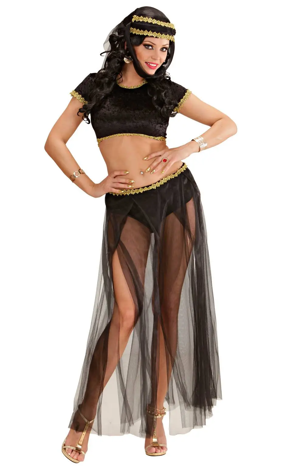 Cette tenue de danseuse orientale comprend un top en velours, une jupe avec voiles ainsi qu’une coiffe.