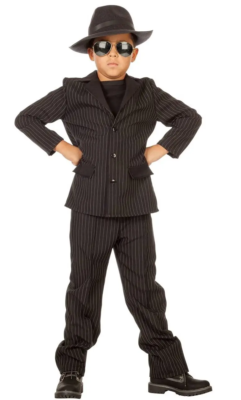 Costume de gangster pour garçon. La tenue est noire avec de fines rayures claires est fidèle au stéréotype du gangster.
