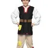 Le costume comprend une large tunique bicolore verte et rouge décorée de galons dorés, un pantalon et un bonnet assortis ainsi qu’une collerette en tulle.