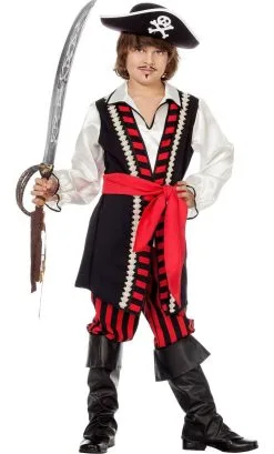 Costume de pirate enfant noir et rouge. Une tenue de pirate parfaite pour parcourir les mers du globe en quête de trésors.