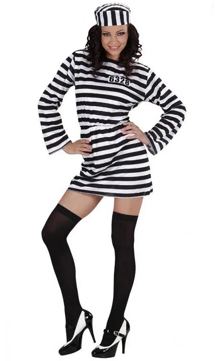 Costume de Prisonnière à petit prix. Un personnage de détenue facilement identifiable avec ses rayures en noir et blanc et son matricule.