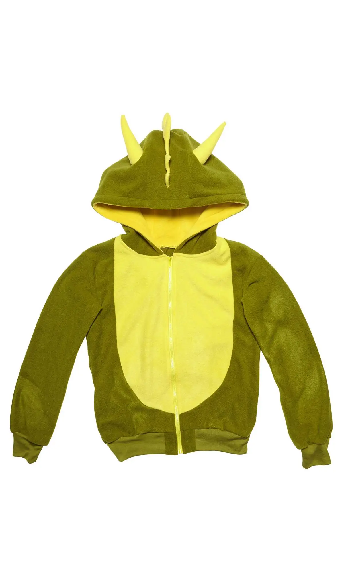 Sweat à manches longues avec fermeture à glissière sur le devant et capuche supportant les cornes et la crête dorsale du dragon.
