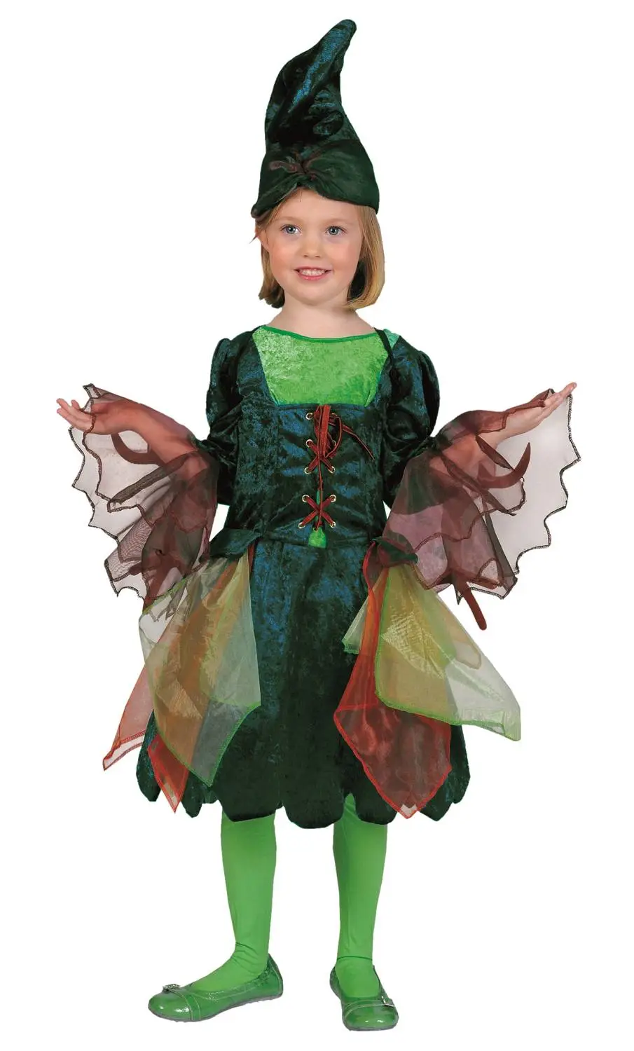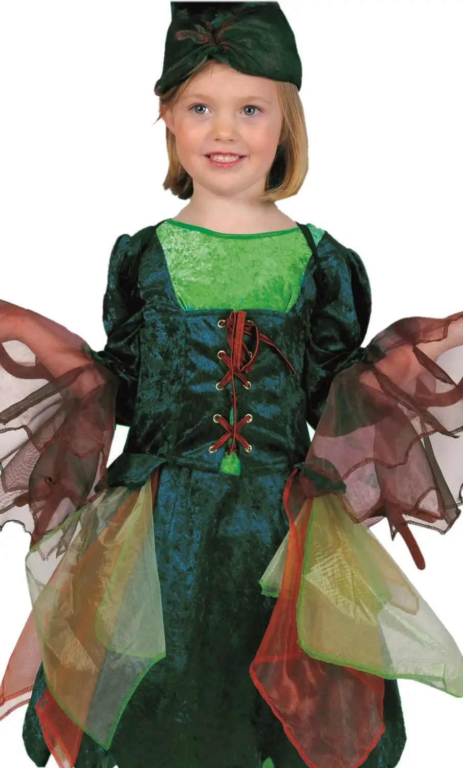 Cette superbe tenue d’elfe comprend une robe et un bonnet assorti, aux couleurs de la forêt.