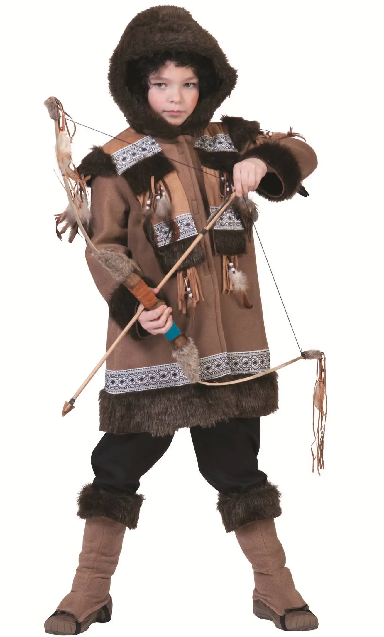 Costume d’esquimau pour enfant. Le déguisement comprend une veste longue à capuche et une paire de sur-bottes. Pantalon et arc ne sont pas fournis.
