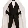 La robe est en velours et l’ensemble est décoré d’un tulle aux petites étoiles argentées et d’une bordure de marabout blanc en plumes.