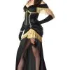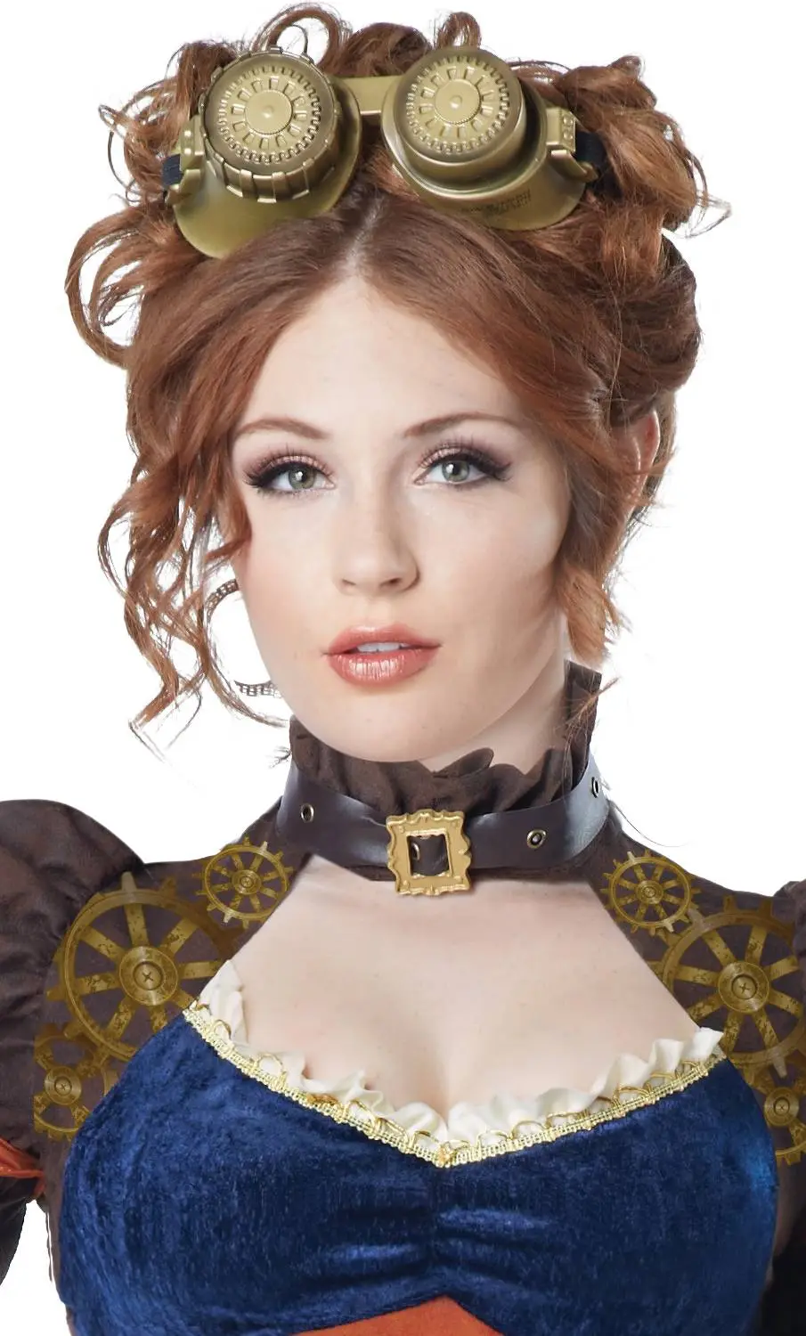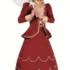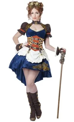 Le costume est complet : une superbe robe avec des impressions et un corset victorien, des mitaines, des fausses lunettes et une paire de guêtres.