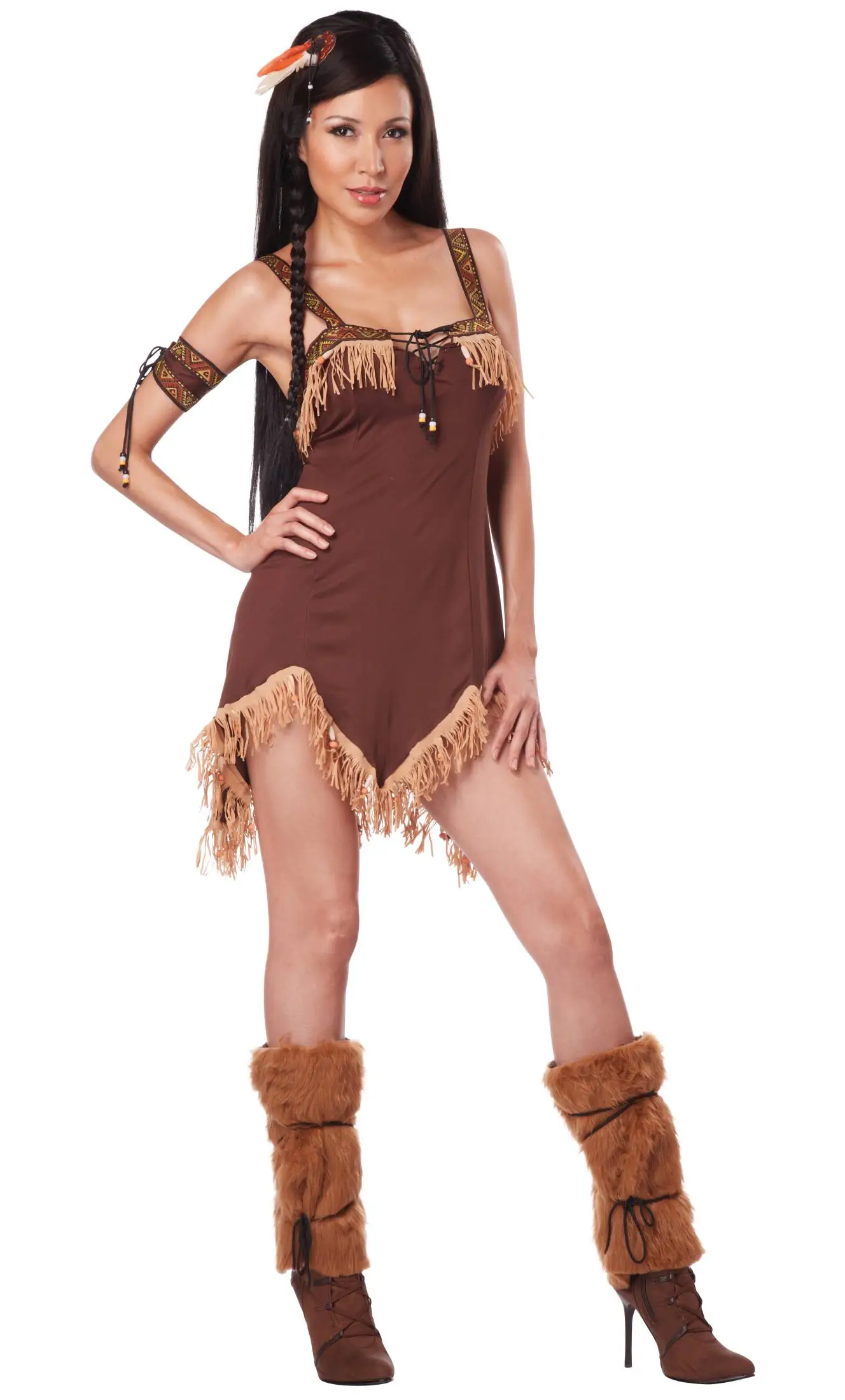Costume d’indienne pour femme. Un déguisement composé d’une robe avec franges, d’un tour de bras, de jambières et d’une pince pour cheveux.