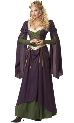 La robe est violette et vert olive. Elle a des manches longues et un haut de style corset décoré de brocart crème. La touche royale de ce costume de femme médiévale est apportée par la couronne or décorée de pierres.