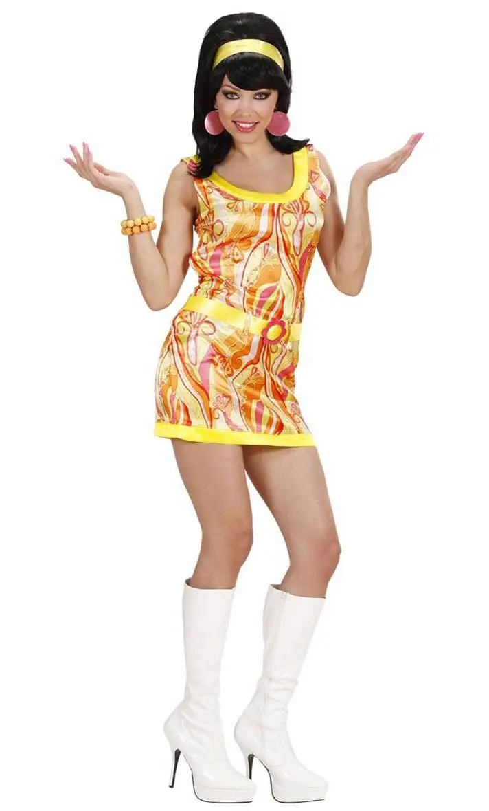 Le costume est une mini robe seventies à dominante orange avec ceinture et bandeau pour cheveux.