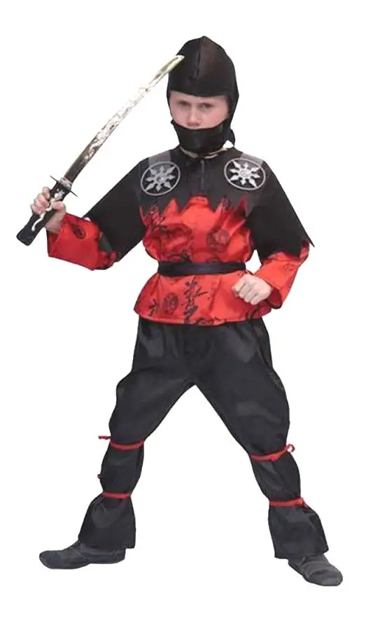 Déguisement de ninja pour garçon. Le costume est complet, satiné noir et rouge, pour incarner un personnage bien connu des garçons.