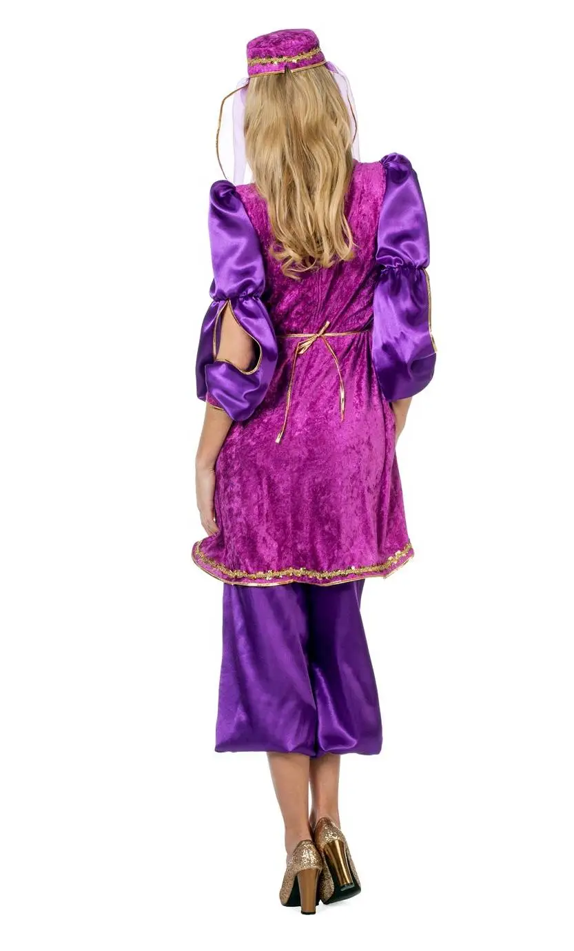 Ce superbe costume se compose d’une chemise galonnée avec fermeture zip au dos, d’un pantalon élastiqué à la taille et d’une coiffe orientale avec voile assortie.
