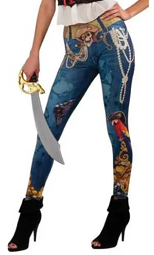 Costume de pirate pour femme. Une tenue originale avec un superbe legging imprimé de motifs se référant à l’univers de la piraterie.