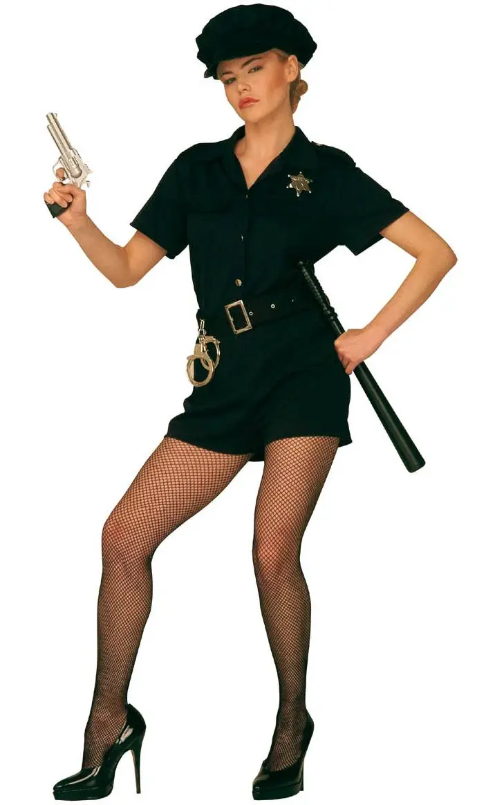 Costume bleu nuit composé d’un combi-short avec ceinture et casquette de policière.