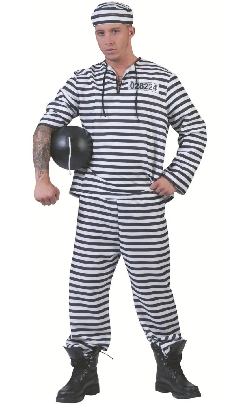 Costume de prisonnier pour homme rayé noir et blanc. Ce déguisement de bagnard complet comprend la tunique, le pantalon et le calot.