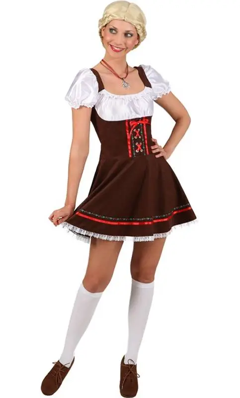 Costume tyrolien edelweiss aux finitions soignées. Une robe dans des couleurs traditionnelles brunes et blanches, pour femme.