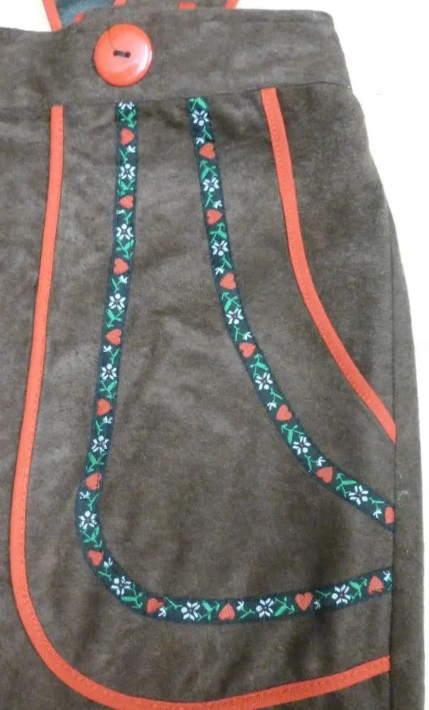 Elle est décorée d’un liseré rouge et d’un petit galon fleuri au niveau des poches et des bretelles.