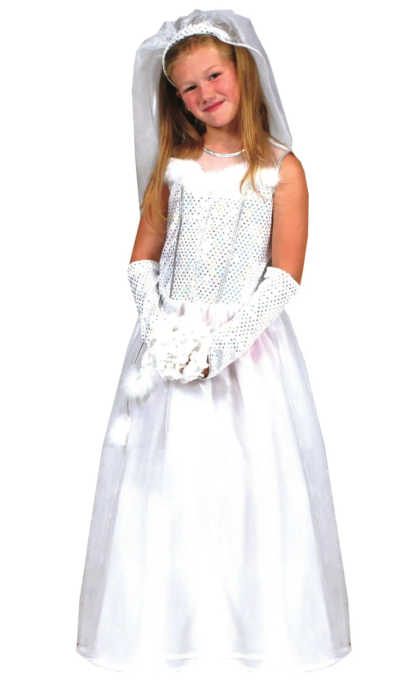 La robe blanche est fournie avec un voile et une paire de gants.