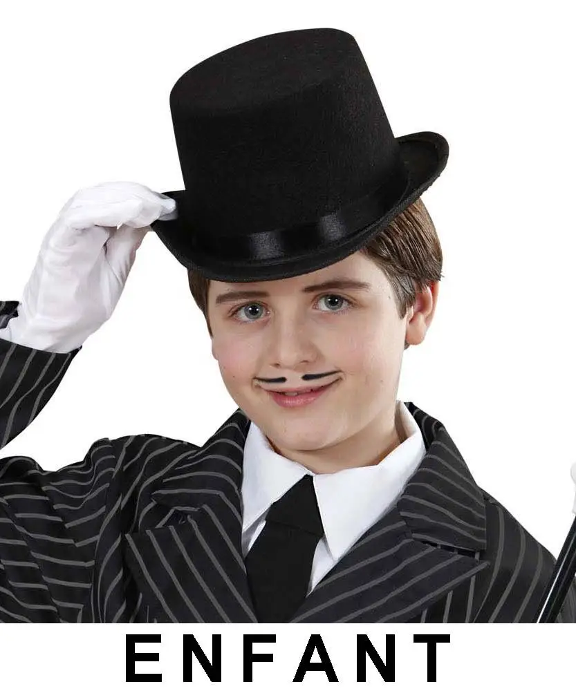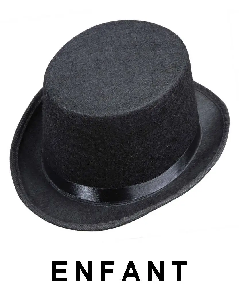 Haut de forme pour enfant, en feutre noir décoré d’un ruban satin. Un couvre-chef distingué proposé en petite taille.