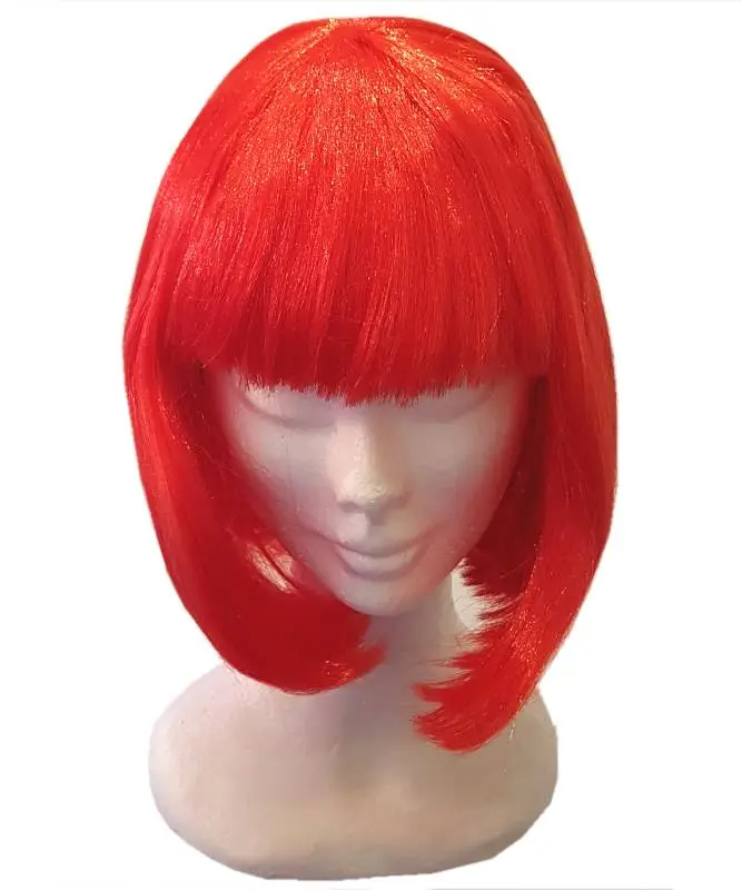 Perruque rouge à la coupe au carré avec frange. Les cheveux sont lisses et composés de fibres synthétiques.