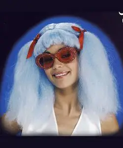 Perruque de style poupée de couleur tendre bleue. Les cheveux sont réunis en couettes sur chacun des côtés.