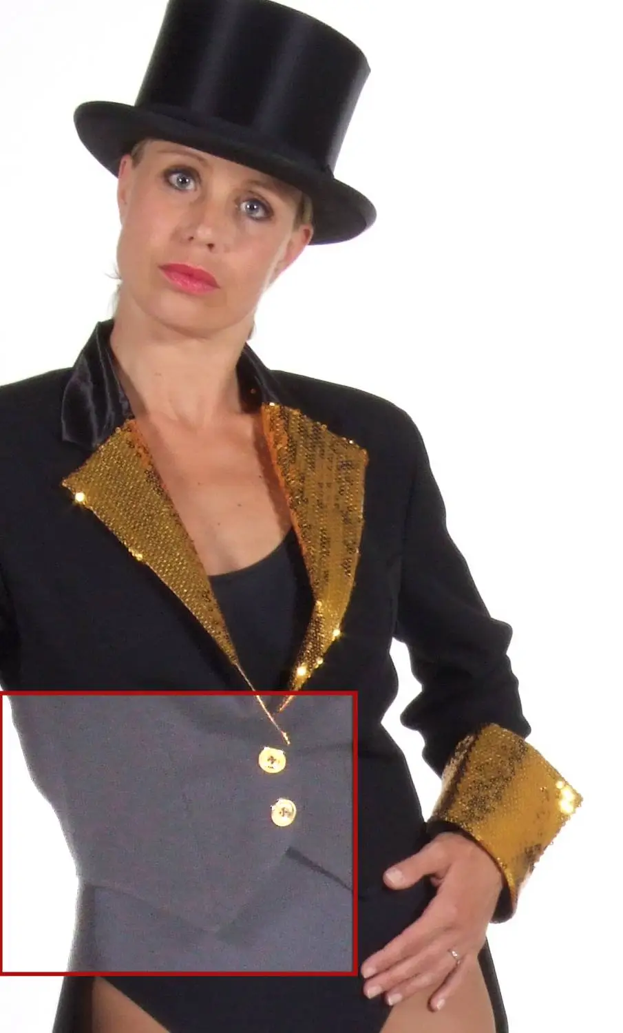 La forme queue de pie du dos et la coupe gilet du devant en font une veste mettant les jambes en valeur et particulièrement seyante.