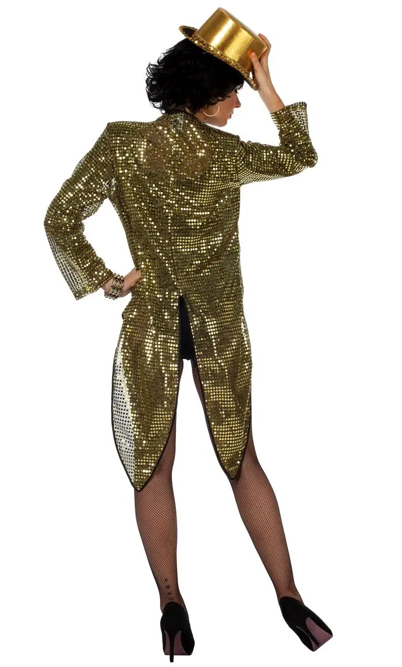 Veste à queue de pie confectionnée dans un tissu à paillettes or avec revers noirs.
