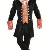 Cette superbe tenue d’époque 17ème ou 18ème siècle reprend les standards des habits de cette période avec ses manches pagode, sa partie brocart dorée aspect bustier et sa jupe au devant volantée.