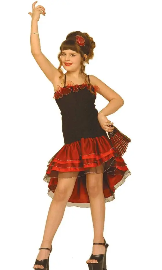 La tenue Flamenco est noire et rouge et est complétée d’un bandeau pour cheveux avec fleur rouge.