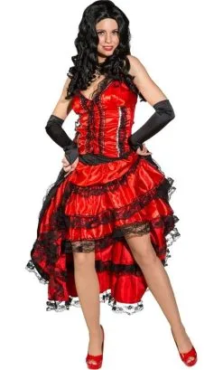 La jupe en satin est formée par de nombreux volants décorés de dentelle. Deux boutons permettent de relever la partie avant laissant entrevoir le satin rouge et formant une traine au dos et dévoilant vos jambes.