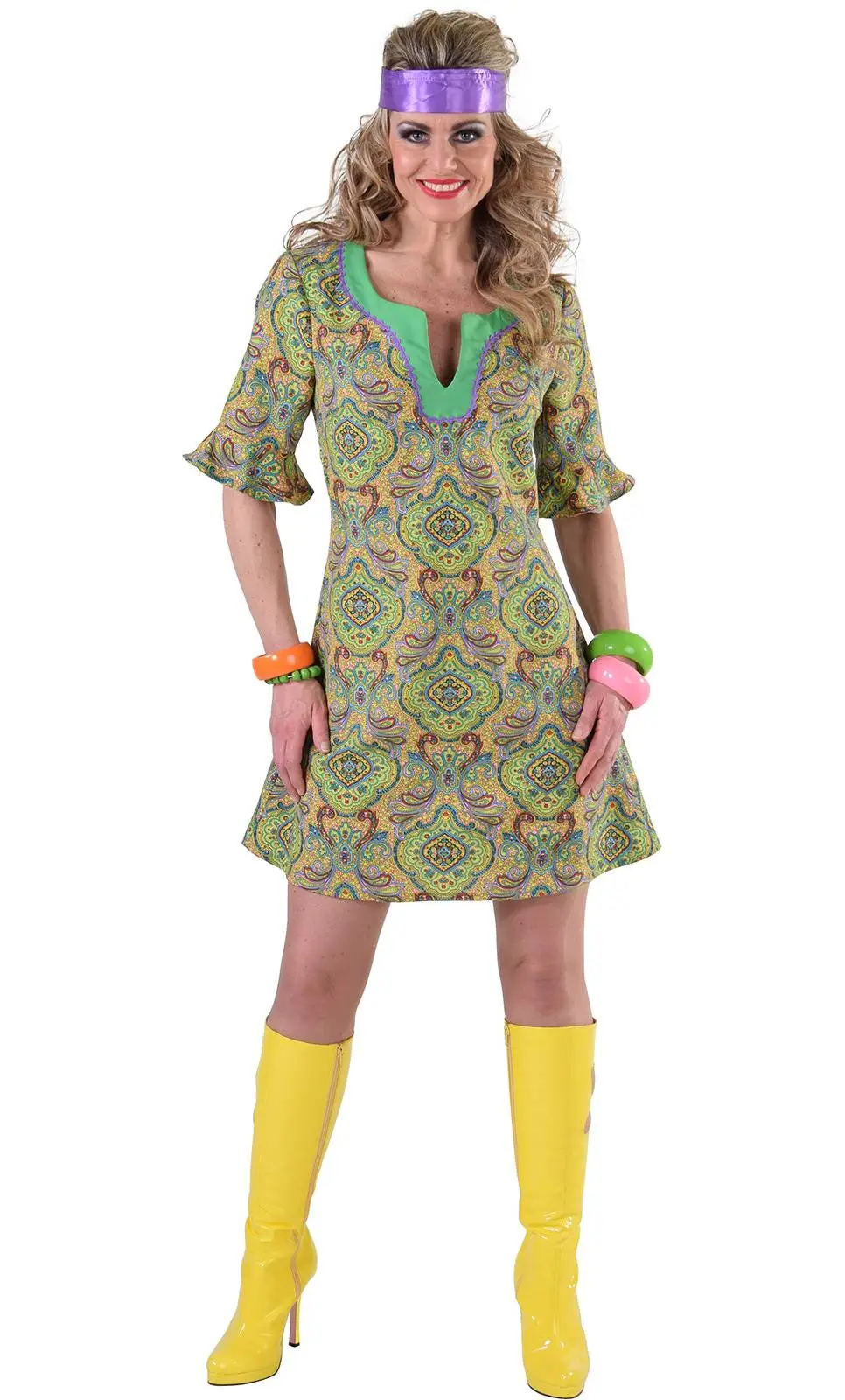 Cette robe dans l’esprit hippie est pourvue de motifs multicolores rappelant cette période ainsi que d’un galon violet décorant le col.