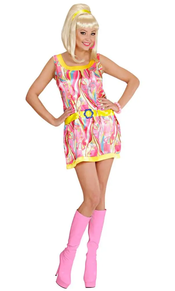 Mini robe seventies à tendance rose et jaune, avec ceinture et bandeau.