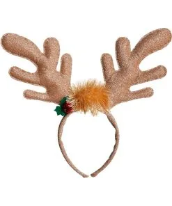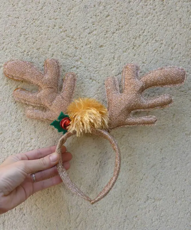 C’est une jolie fantaisie entrant dans le thème de Noël lorsque lutins et rennes se disputent la première place. Ce serre-tête de renne à l’effet brillant aura la vedette à coup sûr parmi les autres têtes coiffées de traditionnels bonnets de Noël.
