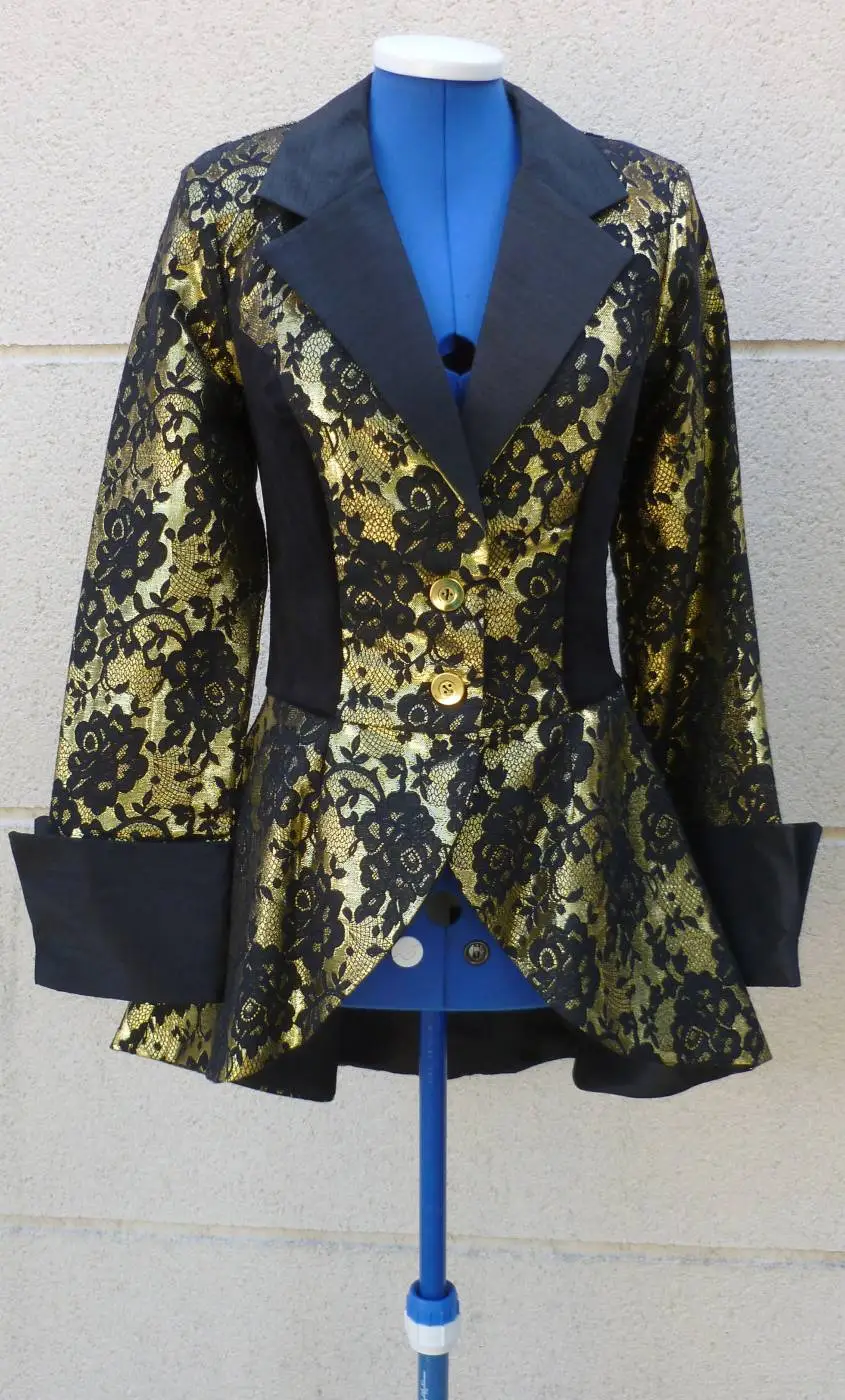 Complétée par un haut de forme, une paire de collants ou d’une culotte cabaret cette veste sera idéale pour tout spectacle de scène.