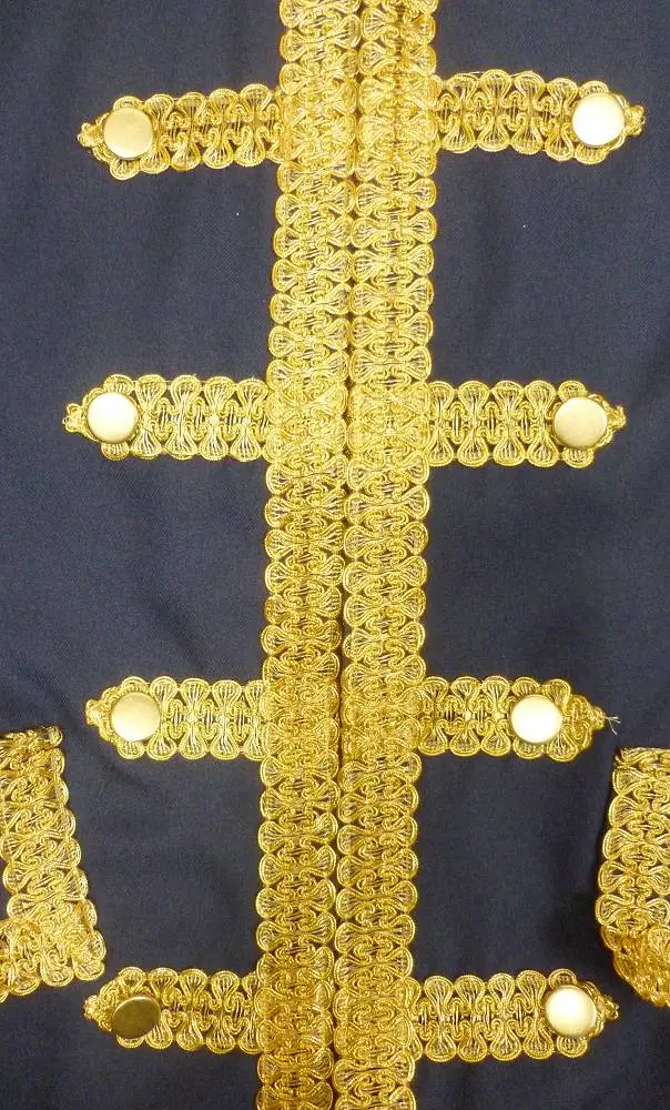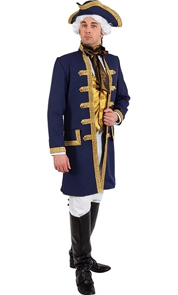 Veste de marquis bleu et or en grande taille homme. Cette veste de très belle qualité est fournie avec le foulard assorti à porter en jabot.