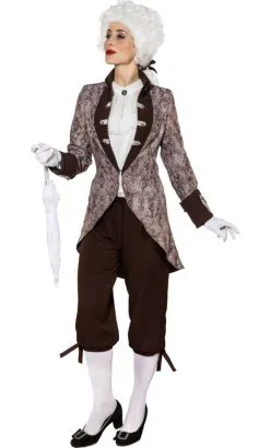 Galons et boutons, argentés sur la photo, sont en réalité vieil or. Les revers de manches, l’encolure ainsi que l’arrière de la queue de pie sont bruns. La doublure satinée est marron.