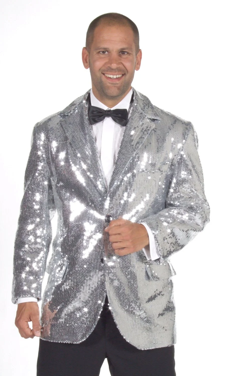 Cette veste d’homme est confectionnée dans un tissu paillettes argent très brillant, entièrement doublée, avec poche intérieure.