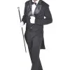 La veste est fermée par 1 bouton, les revers et la partie queue de pie sont doublés en satin.