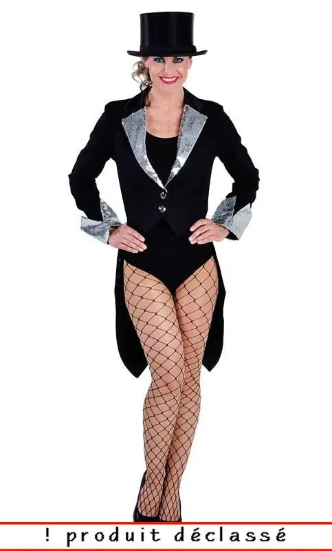 Cette veste noire terminée en queue de pie avec col et revers de manches en tissu paillettes argent est idéale pour toute soirée cabaret.