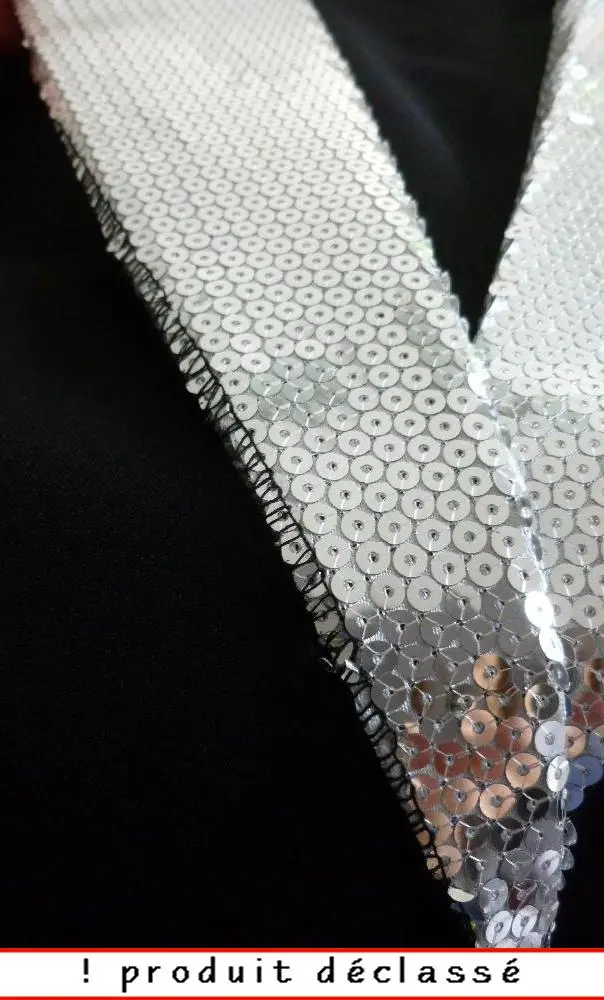 Tissu : Polyester de bonne tenue et paillettes argent cousues.